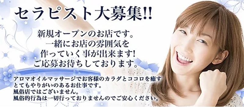 当店はメンズ専門のリラクゼーションアロマオイルマッサージを行ってます。 風俗的な行為は一切ありませんのでご安心ください。アロマオイルマッサージで お客様のココロとカラダを癒やす、 楽しくやりがいのある職場です。